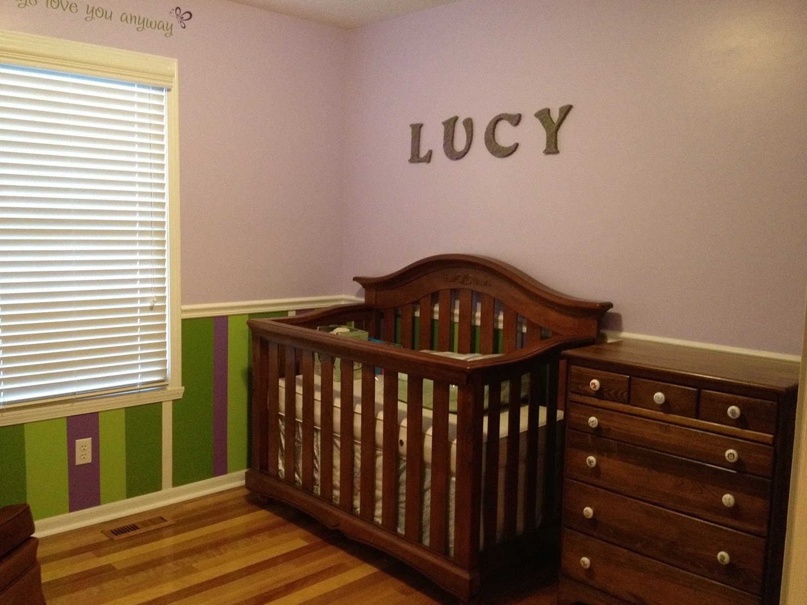 Kyle painted purple letters, wrapped them with green yarn and hung them over her crib. So it's official. No changing it now. So don't ask. Those letters were too hard get hung up. (My slightly OCD husband had to make sure that they were perfectly centered and spaced above the crib).